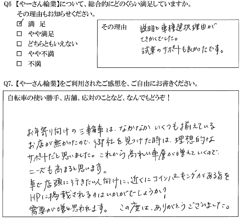 当日は足腰の弱った父のために三輪車試乗を丁寧にご対応いただきありがとうございました。HPから試乗予約ができるので便利でした。 (東京都のお客様)
